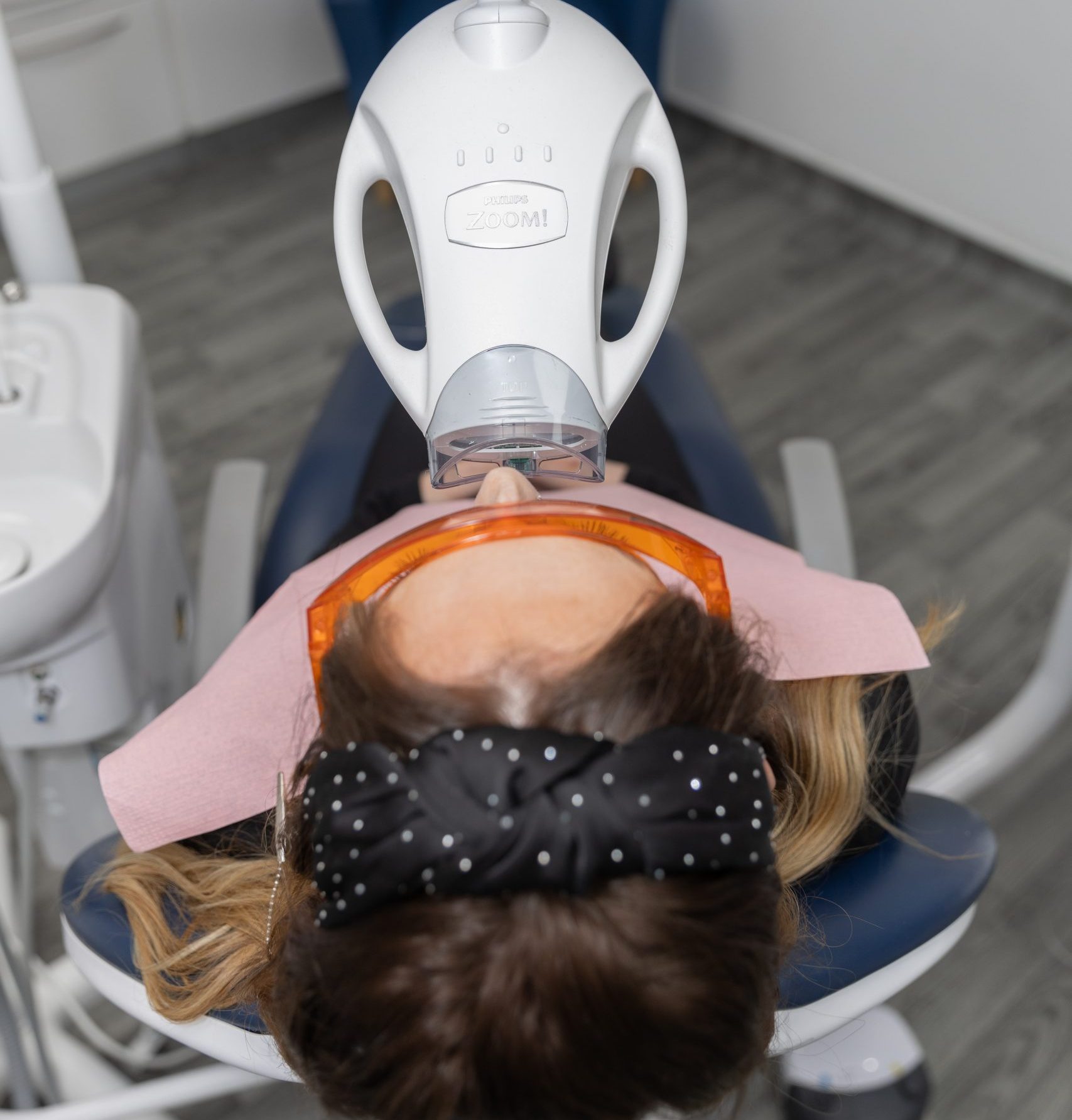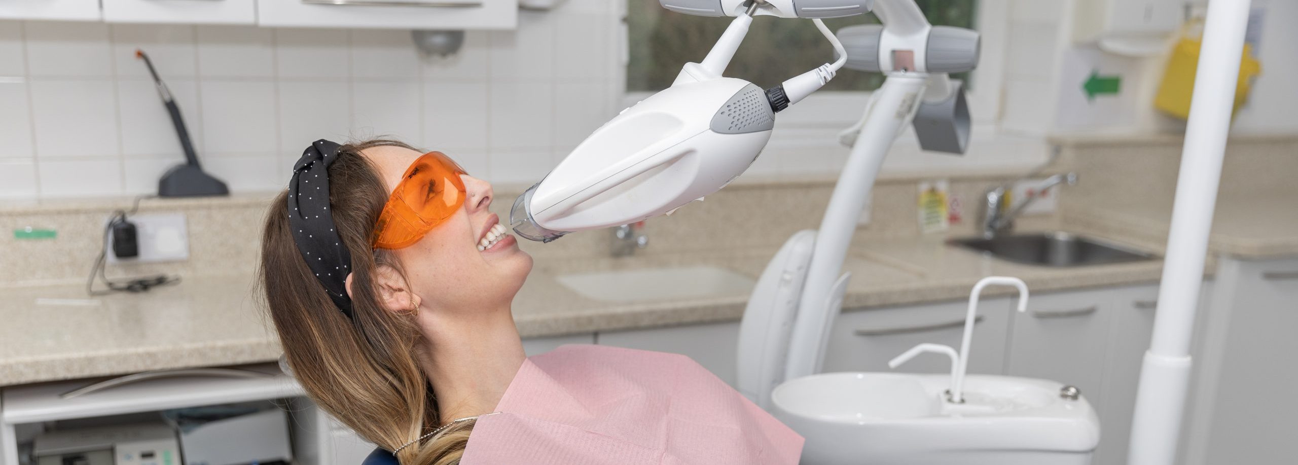 On the day of your whitening treatment, we welcome you to the practice and make sure you are feeling comfortable in the chair. The procedure is very simple. We apply specialised hydrogen peroxide gel to your teeth, and use the Zoom Whitespeed blue light to activate this and transform the colour of your smile.